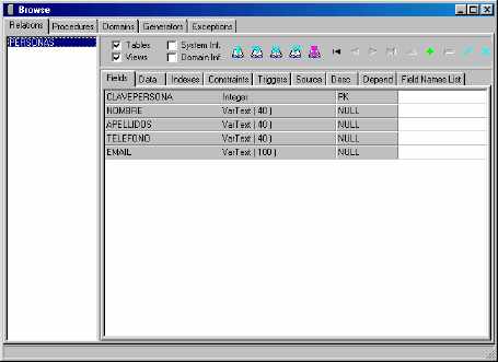 Por el momento podemos verificar que nuestra tabla ha sido creada, oprimiendo el botón Browse que se encuentra en la sección Connection. Este botón debe llamar a la ventana Browse, que se muestra a continuación. Para ver los datos de la tabla, hay que seleccionarla haciendo click sobre su nombre en la lista: