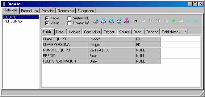 Hasta aquí tendremos las dos tablas, con una integridad referencial entre ellas, y la tabla de EQUIPO con un trigger que utiliza un generador para ir creando los valores de la llave primaria. En la próxima entrega hablaré ahora sí de las transacciones, y un poco más de los triggers y procedimientos.