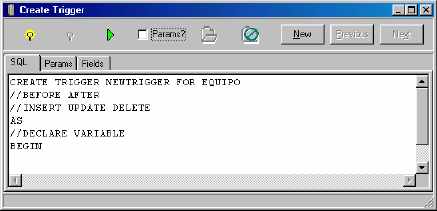 Ahora vamos a crear un trigger que tome un valor del generador y lo asigne al campo CLAVEEQUIPO cada vez que se agregue un nuevo registro. Como se explicó anteriormente, se pueden crear triggers para antes y después de insertar/modificar o eliminar un registro. En este caso, vamos a crear un trigger para antes de insertar.